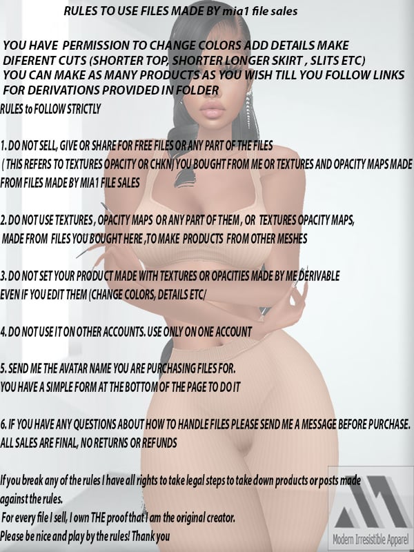 b. You may not use any part of the textures or opacity maps to create other products, such as clothing or accessories. This rule excludes making a variety of the same product using links for derivation I provided